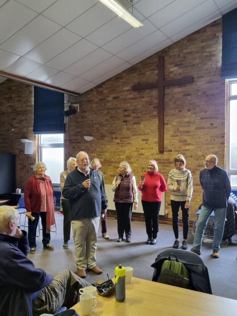 Our Audience were the Movers and Shakers a group linked to the Church where they meet for coffee, chat and some targeted exercises. We started the proceedings with a general talk on the history of Bells and handbells, which included our exercise to show the working of change ringing. (Interestingly we also learnt that the Church in the Pastures was very close to the site of an old bell foundry in Bellfields in Downley).